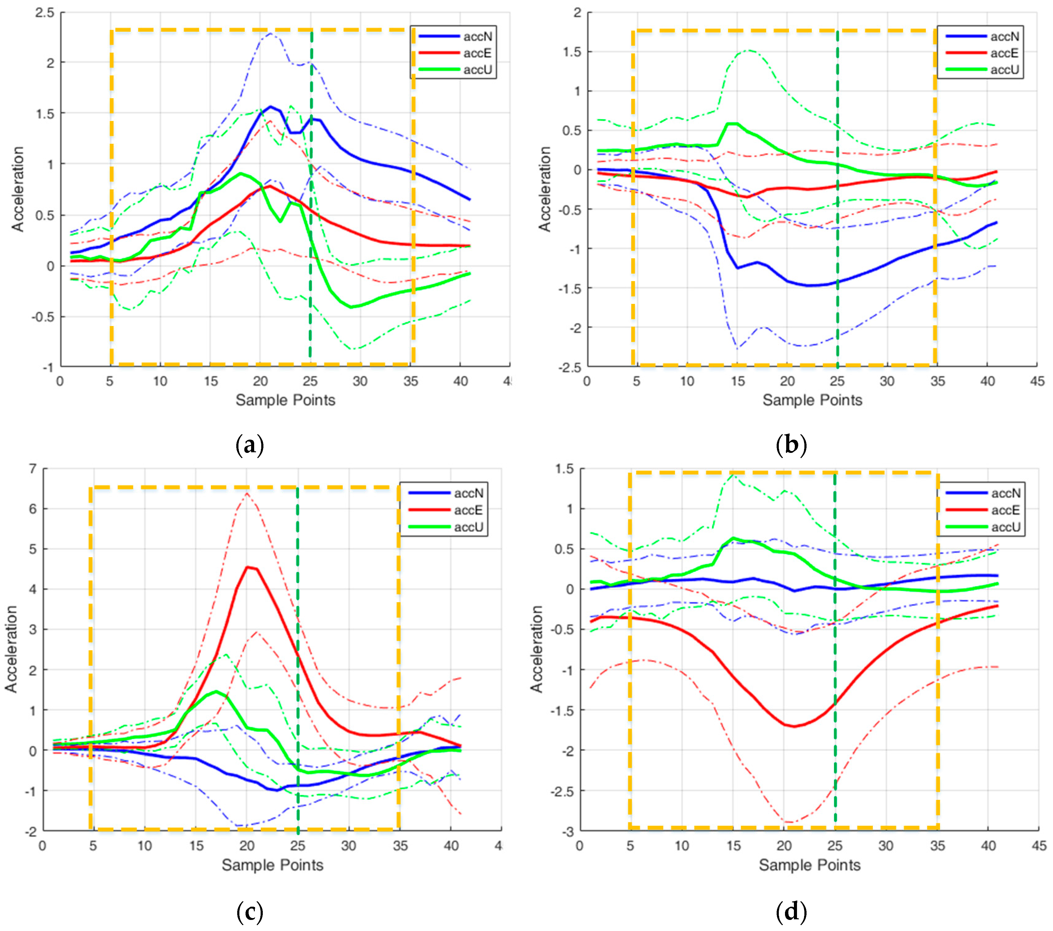 Figure 7c illustrates the left motion and the acceleration (red line) in user’s right direction features an obvious difference compared with the other two axes. Similarly, for the forward and backward motions, the accelerations in forward or backward directions exhibit more diversity.