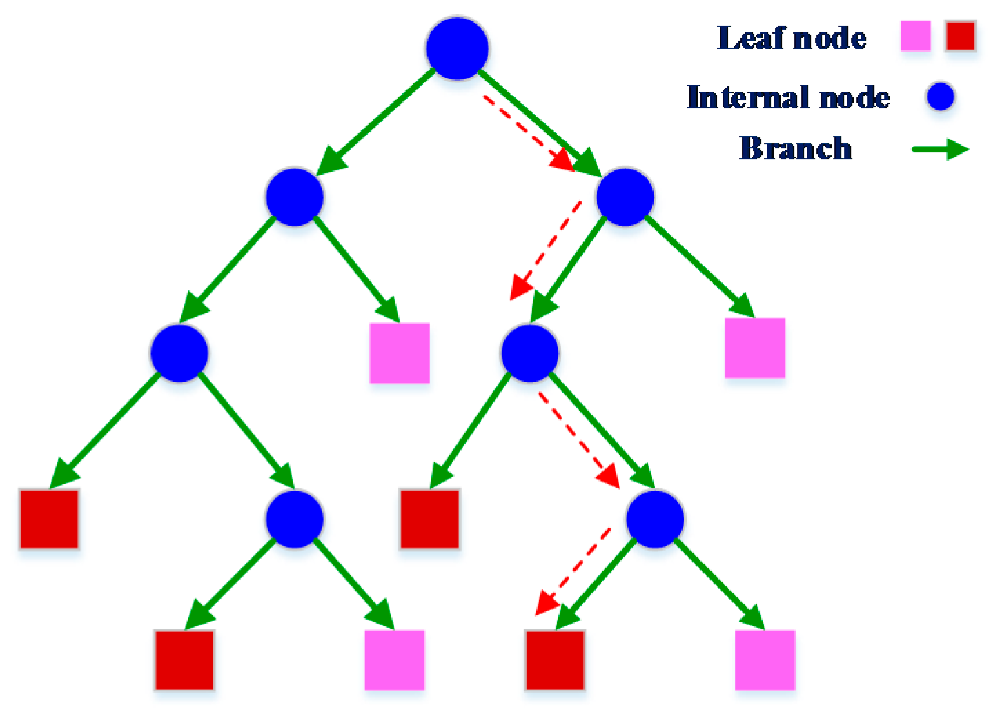 Figure 8 draws the graphical model of the decision tree. The blue circles denote the internal node that executes the test on the feature (comparison of the feature with trained parameter), the green arrows denote the test outcomes and the rectangles denote the different labels or classes. The red dashed lines from top nodes to the leaf nodes represent a decision process or classification rule.