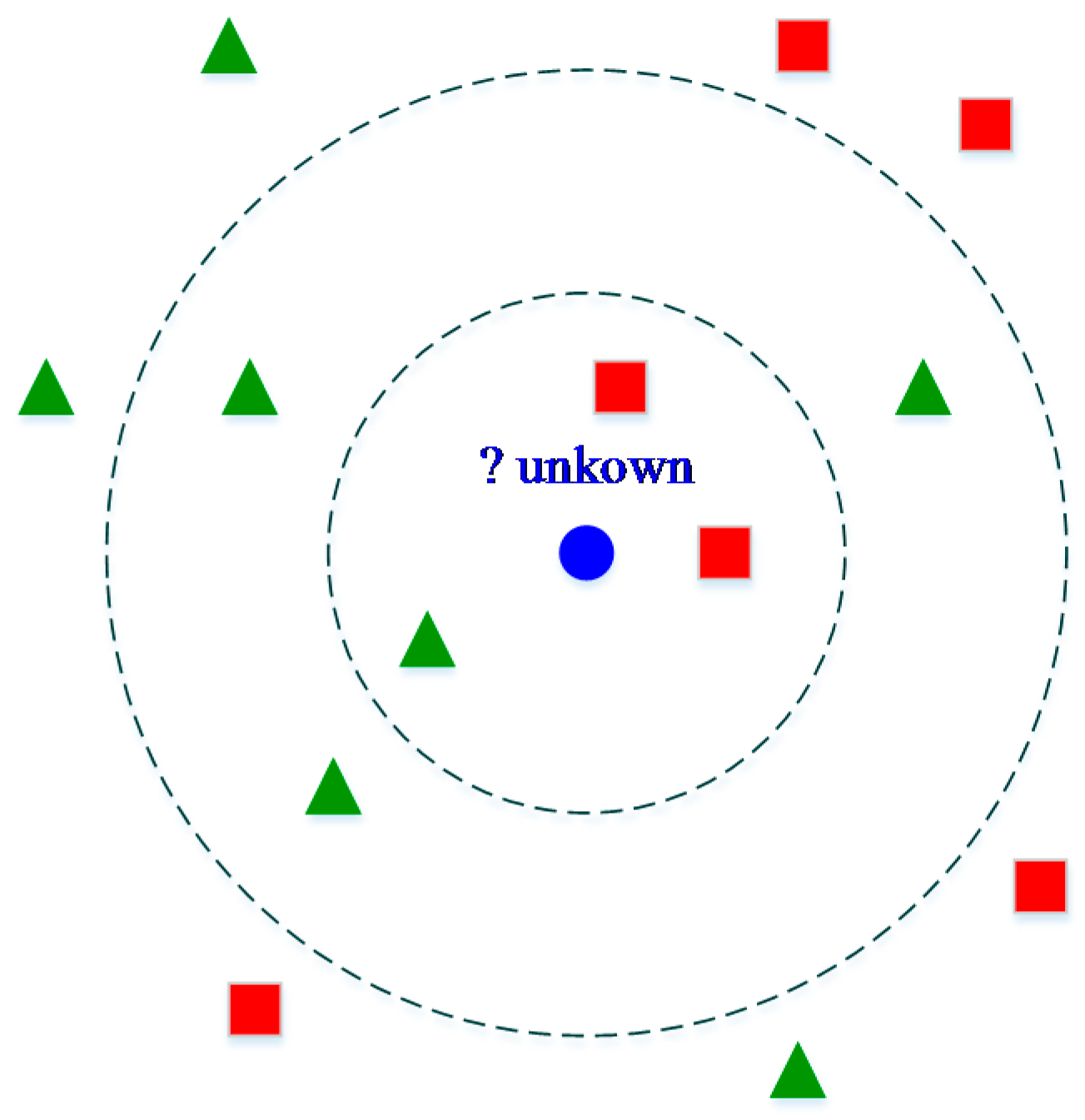 Figure 9, the test sample (blue circle) is classified by the neighbors class, either green square or green triangle. If k is selected as 3, the test sample is assigned to the red square because two of its k neighbors belong to red square. In the same way, if k = 5, the test sample is assigned to green triangle class. Hence, the main idea of kNN is that the category of the predicted object is decided by the labels of the neighbors’ majority. Additionally, the votes of these neighbors could be weighted based on the distance to overcome the problem of non-uniform densities of the neighbor classes.