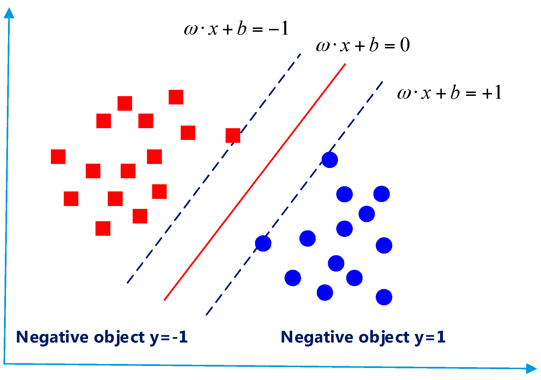 As shown in this figure, the optimal separating hyper-plane (solid red line) locates the samples with different labels (blue circles 1, red square −1) in the two sides of the plane, and the distances of the closest samples to the hyper-plane in each side become maxima. These samples are called support vectors and the distance is optimal margin. The specific illustration of the SVM classifier can be found in the literature [