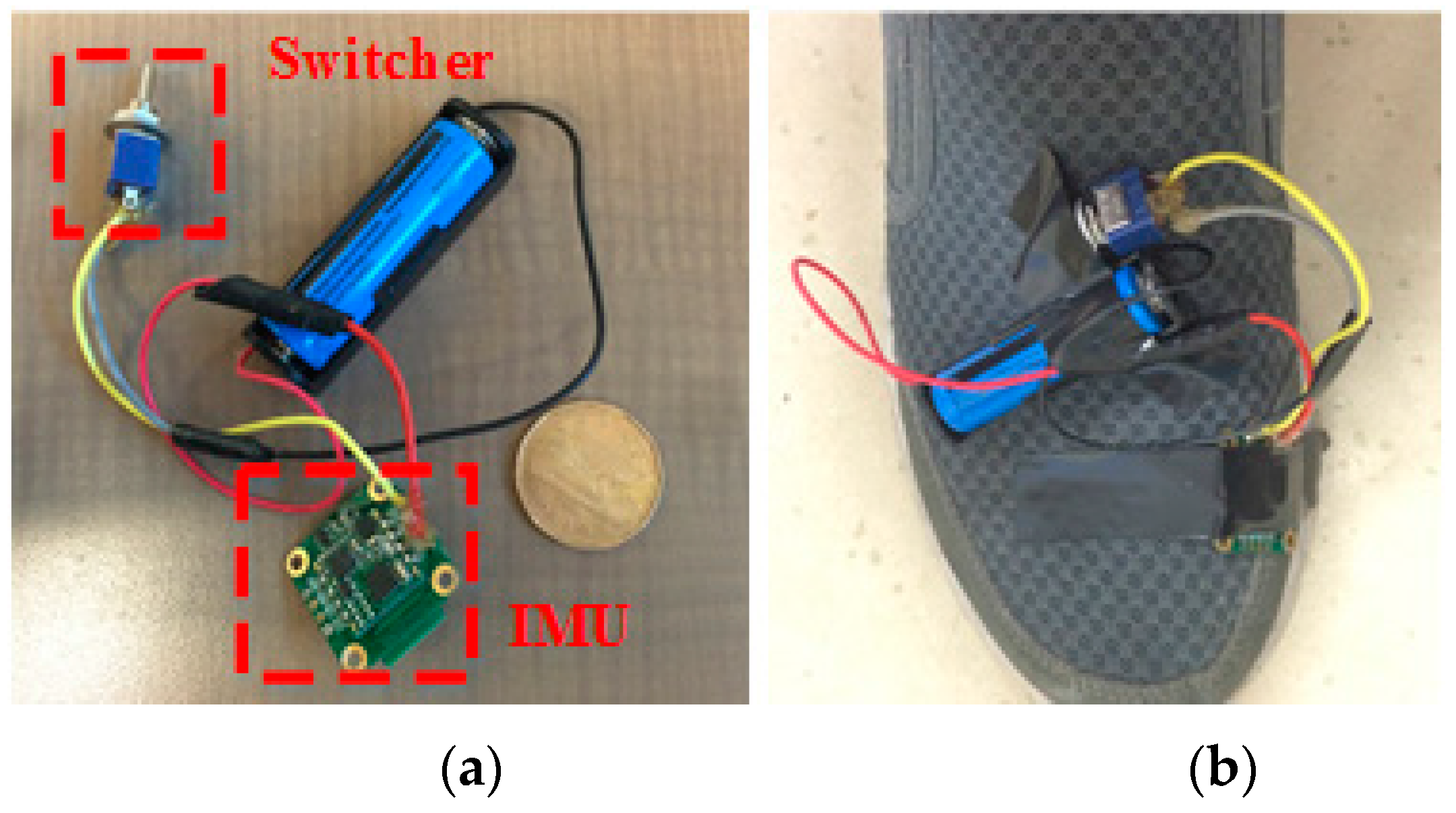 Figure 11 shows the system hardware platform. In this platform, a 3.7 V lithium battery (blue one) is used to provide the power supply. The IMU module has a small size, and is very convenient to mount on user’s shoe.