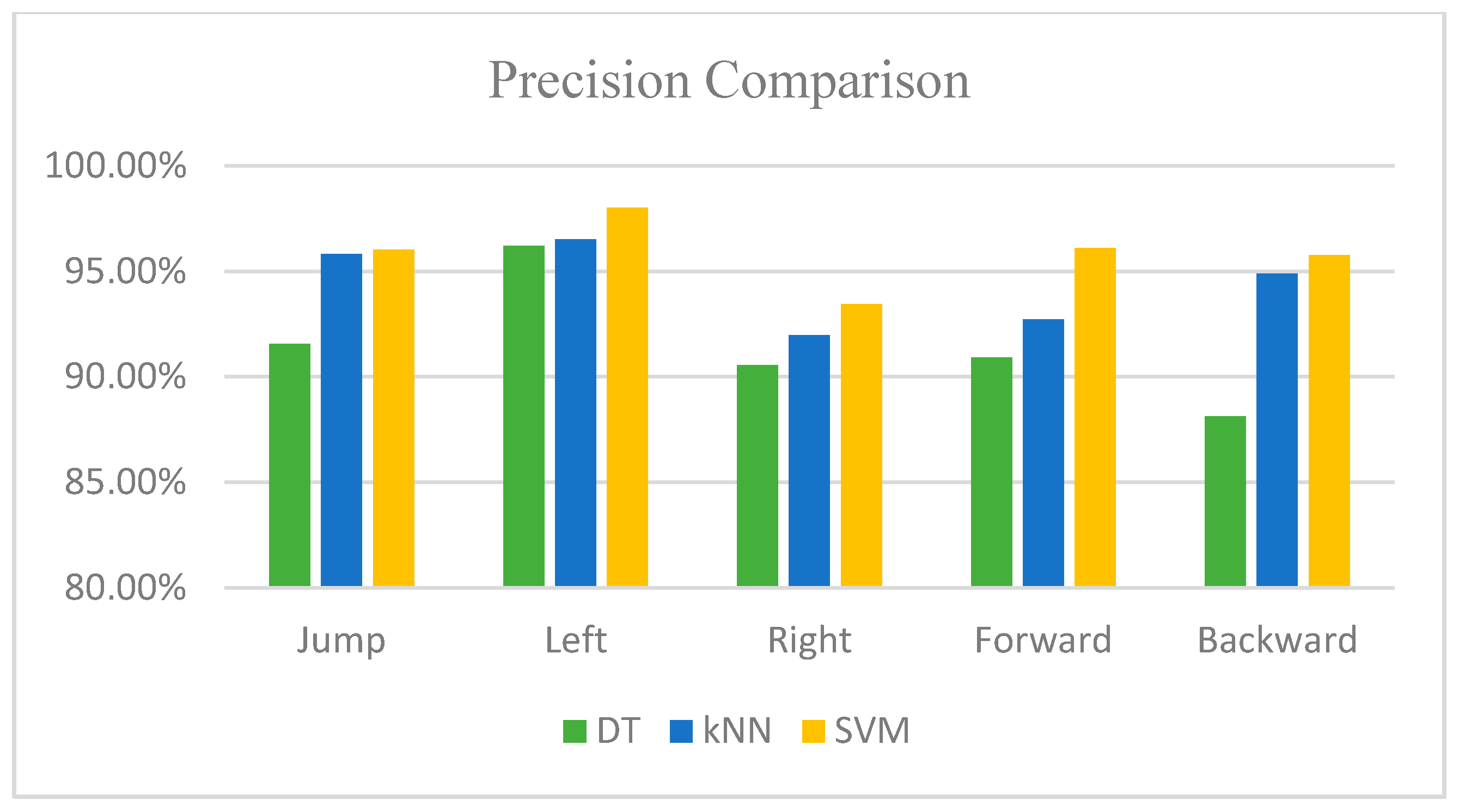Figure 13, the SVM classifier has an overall better performance than the other approaches. Moreover, the average time for each classifier to make the decision on the motion type is: decision tree classifier 0.0056 ms; kNN, 0.53 ms; and SVM, 0.0632 ms. Although the decision tree classifier has the least response time for identification, its performance on the motion type is not satisfied. The response time for SVM is 0.06 ms and it is in an acceptable time frame because this lag level will not cause an observable delay on user experience. Hence, combined with the performance and the decision time of each classifier, the SVM classifier achieves the best result and is selected in our proposed system to classify the stepping motions. Additionally, we analyze the misclassified events of each motion to give the profile of errors, aiming to avoid that one specific stepping motion always contributes to the wrong recognition, which is potentially due to unsuitable feature selection or data segmentation. The statistical result is listed in