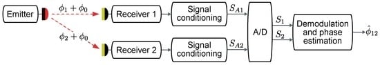 Figure 1 shows the general structure of one of the differential phase measuring units forming the system. and are the phases upon reception, where and are proportional to their respective propagation paths, and is the unknown initial phase of the emitter, common for all receivers hence canceled in the differential measurement. and are the input analog signals, and are the digital signals obtained after undersampling and is the estimated differential phase between both signals.