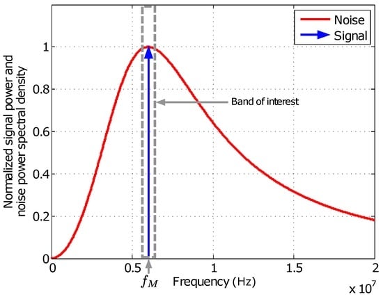 Considering the conditioning stage structure and a flat noise distribution with constant power density before the band-pass filter, which is an adequate approximation for the bandwidth of interest, the analog signal to be sampled will present the single-sided power spectral density shown in Figure 2, where both signal and noise are normalized to and , respectively, where is the signal amplitude. All the information is contained in the phase of the modulated signal at , while the noise power spectral distribution is described by