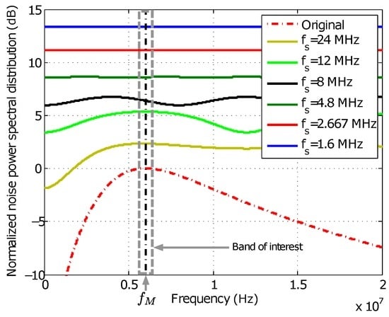 The total overlapped noise spectral density after the A/D conversion is calculated from Equation (9), the sum of the infinite images of the original noise figure being , frequency shifted every integer multiple of the sampling frequency :