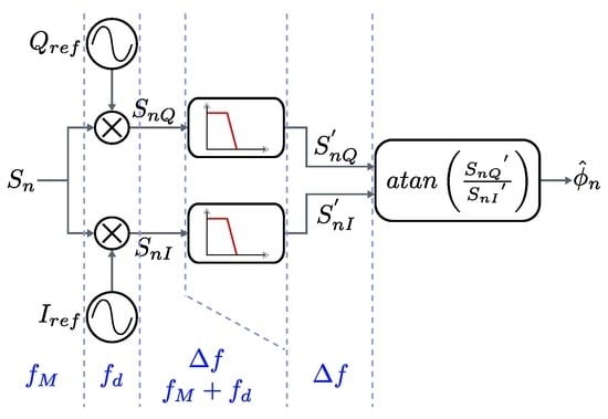 In this section, the model for the complete phase estimation process will be explained and developed so that an expression of the final phase error can be defined as a function of the signal and noise power levels in the input of the demodulation stage. This SNR () will be determined, as shown in previous sections, by the amount of noise aliasing defined by the band-pass sampling frequency.