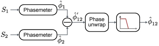 The resulting signals () will present a low frequency component around and a high frequency component around plus , which is digitally filtered. Finally, an arctangent estimator is applied to extract the phase from the low frequency components (). The resulting phase is not constant in static phase conditions due to the frequency difference between the incoming signal and the references, and should be subtracted with an equivalent phase obtained from another sensor, simultaneously acquired and demodulated. Finally, the resulting signal phase transitions are corrected, producing the final phase signal to be filtered in order to get every single phase-shift read-out.