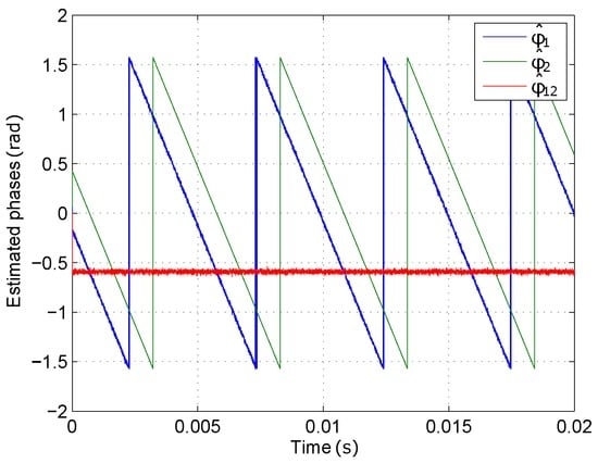Figure 5 shows the phasemeter for every single incoming sequence, formed by the I/Q demodulator and the arctangent-based phase estimator. Figure 6 shows the differential phase computation and the final filtering stage. The outputs of two phasemeters, simultaneously processing the signals from two sensors, are shown in Figure 7. Note that both slopes, whose values depend on , are equal for both signals, therefore a constant value is yielded by the subtraction, corresponding to the estimated relative phase difference between them.