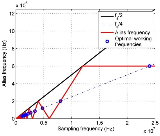 Mixing in the demodulation stage splits the incoming signal into two spectral components with equal power, frequency shifted and , respectively, where is the frequency of the reference signals used for demodulation. In order to guarantee that the high frequency component after the mixing is sufficiently attenuated by the digital filter in every I/Q branch, so its effect can be neglected, optimal working frequencies are defined so that the separation between both components is maximized. This allows, for a given necessary attenuation, reduction of the complexity of the digital filter, hence its computing cost. The frequency difference between the modulation frequency of the input signal and the demodulation references frequency is defined as small as possible to maximize the separation between components. Considering this, the maximum separation condition implies using sampling frequencies so that the resulting alias in the band lies in . This way, after the mixing, the low frequency component will be close to DC, and the high frequency component will be close to , providing the maximum possible separation for a given sampling frequency. Possible alias frequencies as a function of sampling frequency are depicted in Figure 8, together with the sampling frequencies that fulfill the defined criterion.