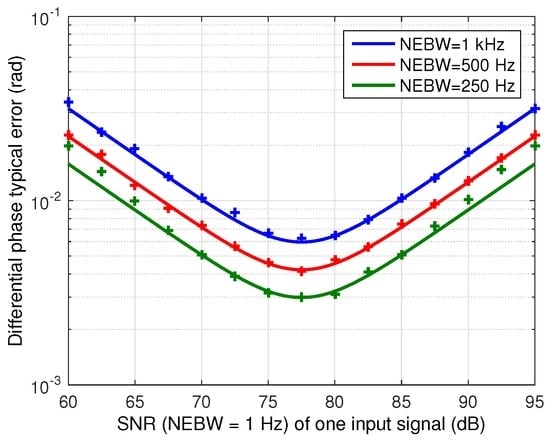 Phase typical error for different noise equivalent bandwidths as a function of SNR of one digitized input signal ([60 dB, 95 dB]) while the other input signal SNR is its complementary value ([95 dB, 60 dB]). Theoretical (solid) and simulations (crosses).