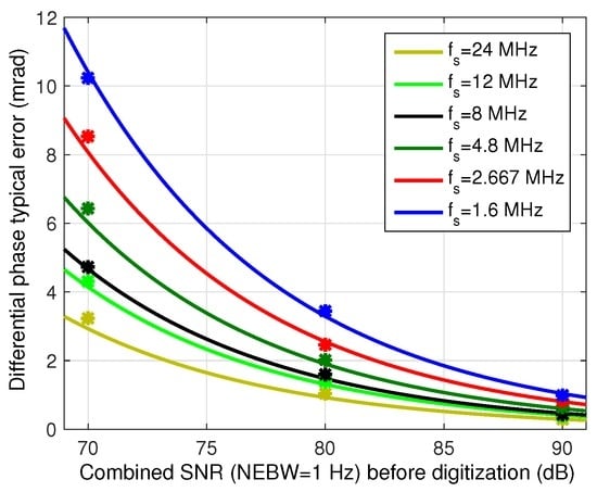 In the particular case of the system that contextualizes this work, a maximum error has been defined for the application setup. The standard deviation of the differential distance error for this setup must be smaller than 5 cm for the worst SNR case (70 dB). Taking into account the propagation speed of the optical signal and the modulation frequency of 6 MHz, this distance error translates into a maximum standard deviation of the differential phase error of mrad. Analyzing the results of the study and tests, sampling frequencies below MHz would cause too much noise aliasing after the digitization, yielding unacceptable differential phase errors for the particular application constrains. Note that, given this error constraint, minimum acceptable sampling frequency is 2.5 times smaller than the minimum sampling frequency (12 MHz) to be used if, instead of band-pass sampling, standard low-pass sampling had been applied to digitize the signals. However, the error increment between these two cases is 1.4 times. Thus, sampling frequency is reduced by at the cost of reducing precision by .