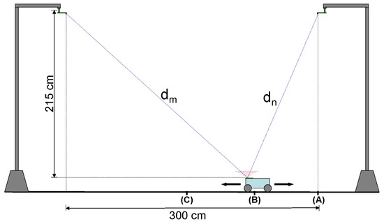 Figure 11 shows the setup used to carry out the real measurements. The emitter is on board a mobile robot and two receivers are placed m above the emitter and separated 3 m from each other. The robot was placed on three different locations (A,B and C in the figure) between both receivers, so that the combined SNR between both receivers would reach the desired levels. The minimum SNR case corresponds to the position (A), where the robot is directly under one of the receivers. The combined SNR in this case is 70 dB, dominated by the most distant receiver, given the high received power difference between both. The maximum SNR case correspond to the middle point between two receivers (C), where the individual SNR for every receiver is 93 dB, so the combined SNR is 90 dB.