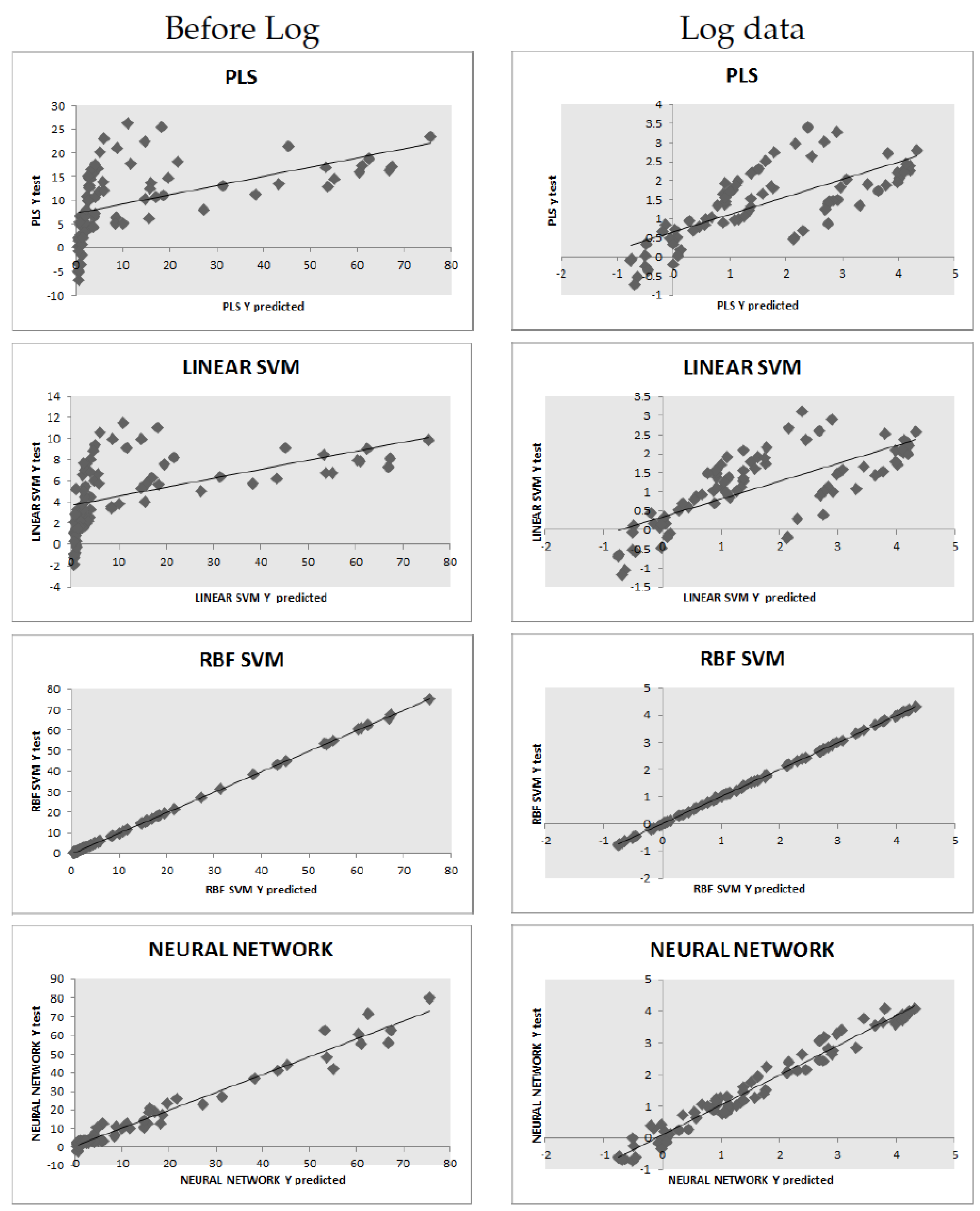 Table 2 shows the cross-validation NRMSE for each learner, before log and log data, resp. It is clearly seen that the linear models, PLS and the linear SVM, are outperformed by the non-linear models, the ANN and the SVMR-RBF, the latter being the best model overall, although the difference of two models is not statistically significant: a Wilcoxon signed-rank test comparing the results, in the log data, shows that the null hypothesis that the difference between the cross-validation NRMSE medians is zero cannot be rejected at the 95% level (