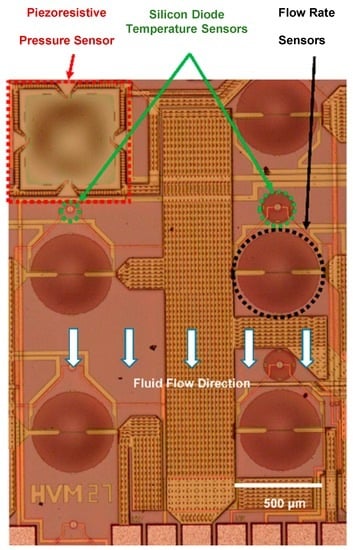 Multiple sensors of similar design were integrated on the same chip keeping in view a number of considerations, e.g., an array of temperature sensors can be utilized for 2D thermal mapping of a hot surface as reported in [19]. Arrays of thermal flow sensors can be used to study the distribution of wall shear stress exerted on the surface of a micro-channel and compared with analytical results [2,5,13]. All three types of sensors, i.e., pressure, temperature and flow rate, are key parameters for experimental fluid dynamics studies. Having multiple sensors on the same chip can help ensure the verification of the individual sensor calibration. Furthermore, the redundant sensors on the same chip can be very useful in industry, where the breakdown of individual sensors results in the complete halt of the assembly line/manufacturing process.