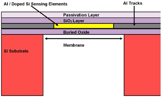 Our 3.8 mm × 3.8 mm multi-sensor MEMS chip (Figure 1) is capable of sensing fluid pressure, temperature and flow rate using a piezoresistive diaphragm pressure sensor, ten thermodiodes and nine hot film sensors, respectively. The chip has been designed using Cadence Virtuoso Layout Editor and fabricated in a commercial CMOS foundry. The sensing elements have been embedded in thin silicon dioxide membranes (thickness ~5 µm). The membranes have been realized by a single, post-CMOS DRIE back-etch step in the same foundry. The BOX (Buried Oxide Layer) acts as an effective etch stop during the DRIE step (see Figure 2). Due to the near-vertical walls etched by DRIE, compact packing of devices on the chip has been made possible. Oxide membranes thermally isolate the sensing elements from the substrate, thus allowing the flow sensors’ high electro-thermal transduction efficiency. Details of each type of sensor with a brief theoretical background are given in subsequent paragraphs.