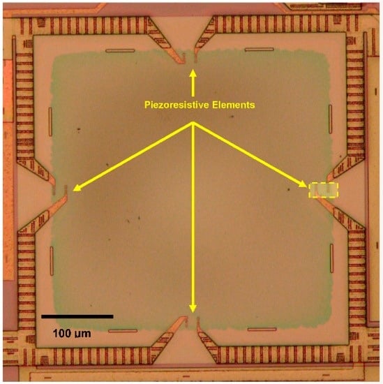 Square membrane pressure sensor in the multi-sensor SOI CMOS MEMS chip. The membrane is made of SiO2 and has a side length of 400 µm. The cadence layout of the boxed piezoresistor is shown in Figure 6.