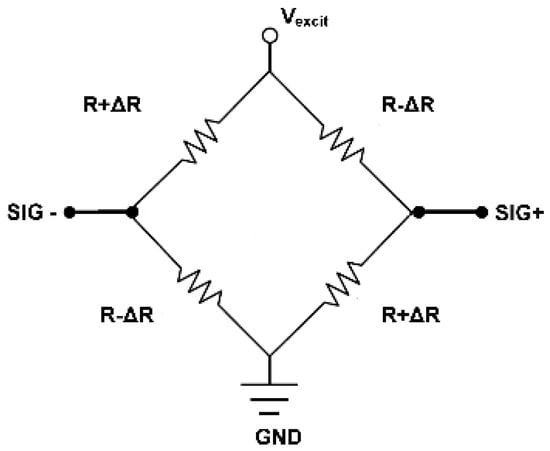 The bottom side of the pressure sensor was sealed at atmospheric pressure using an adhesive. Upon application of pressure, opposite piezoresistors change their resistance by +ΔR and −ΔR. As a result, the signal output at SIG+ and SIG− is offset due to the change in the resistive Wheatstone bridge. The output signal for measurement is given by Vsig: