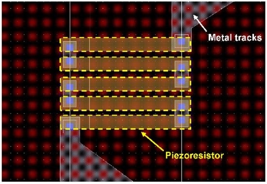 The pressure sensor in our multi-sensor system has a square diaphragm (Figure 4). When pressure is applied, maximum stresses occur at the middle of the four edges of the square diaphragm [29]. Four p+-doped silicon piezoresistors have been embedded at the location of maximum stress in the SiO2 membrane in a Wheatstone bridge configuration (Figure 5). All piezoresistors have similar resistance values (~500 Ω). The Cadence layout of a meander piezoresistor embedded in the pressure sensor diaphragm/membrane is shown in Figure 6. Each piezoresistor has five segments while each of these segments is 16 µm long and 2 µm wide.