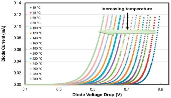To verify the reproducibility of the results among different MEMS chips, thermodiodes from different chips have been characterized, and the results have been compared. Characteristic current-voltage (I-V) curves of the diodes have been recorded over the temperature range of 20 °C–300 °C. Effects of changing temperature on the I-V characteristics of the thermodiode are given in Figure 10.