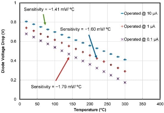 With increasing temperature, the I-V curves shift leftwards. We can see that at constant current, the diode voltage drops with increasing temperature. The voltage-temperature relation of two temperature sensors (TS2 and TS5) on different chips is plotted in Figure 11 for constant current levels of 10 µA, 1 µA and 0.1 µA. To avoid self-heating, low forward driving currents have been applied. The thermodiodes’ sensitivity was recorded to be −1.41 mV/°C, −1.60 mV/°C and −1.79 mV/°C for driving currents of 10 µA, 1 µA and 0.1 µA, respectively. It is worth mentioning that decreasing the drive current increases the sensitivity of the temperature sensors. The repeatability of the results was verified with the help of extensive tests, and the results demonstrate high inter-chip reproducibility of the thermodiodes’ characteristics/performance.