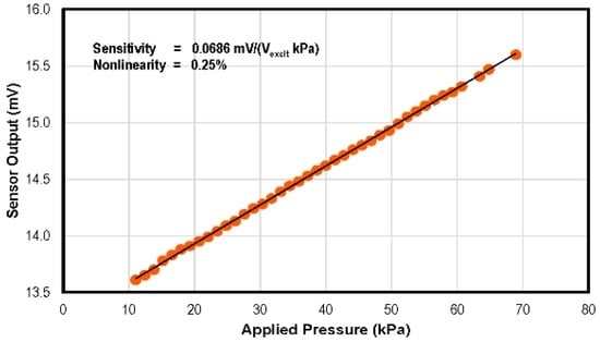Response of the pressure sensor to the applied pressure. The sensor output voltage vs. applied pressure curve has 0.25% non-linearity against the best fit straight line.