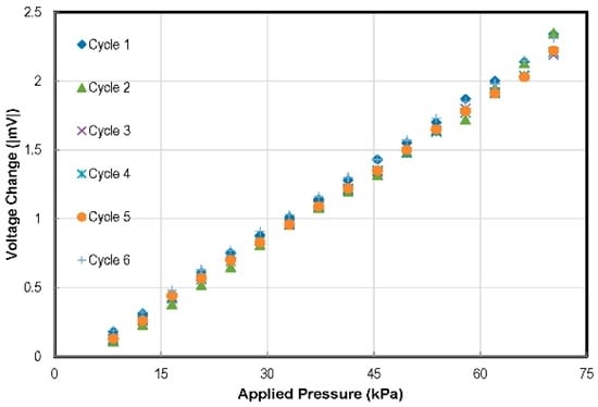 An excitation voltage (Vexcit) of 500 mV was provided to the pressure sensor. The calibration results, as shown in Figure 12, represent the sensitivity of 0.0686 mV/(Vexcit kPa) and 0.25% nonlinearity. To avoid the use of complex compensation circuitry in the sensing systems, designers generally desire sensors to have a linear response. Capacitive pressure sensors have a very non-linear response as compared to the piezoresistive pressure sensors. The desired linearity of the piezoresistive sensors is evident in the results obtained. To evaluate sensor performance repeatability, a number of pressure cycles were applied, and the sensor response was noted. The results are plotted in Figure 13.
