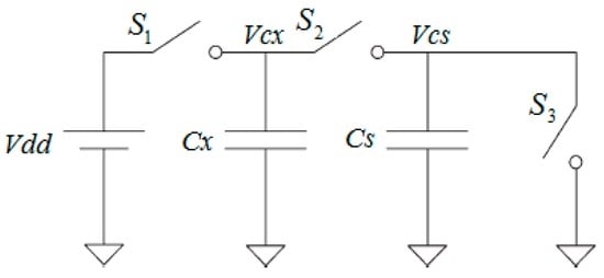 Figure 1 shows the operation of a basic SC branch which was reported by Gaitán-Pitre, Gasulla, and Pallàs-Areny [14]. A series of voltage pulses Vdd is applied to an unknown capacitance Cx and a sampling capacitor Cs. By opening and closing S1, S2, and S3 switches respectively, two non-overlapping phases take place. In the first phase charge is accumulated on the Cx and in the second phase the charge stored on Cx is discharged into the larger Cs. After repeated transfer cycles, the voltage across Cs is compared to a fixed reference voltage. This circuit demonstrates how the charge transfer method works theoretically.
