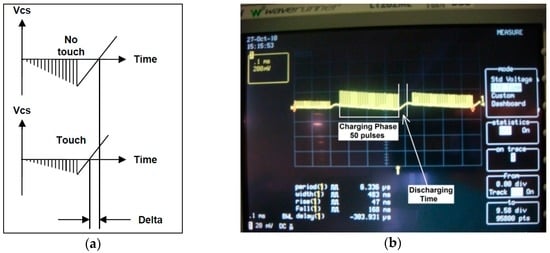When a finger gets closer to the sensor, the finger capacitance becomes in parallel with the sensor capacitance Cx. Therefore, each pulse charges Cs by a smaller amount. Then VCs rises more slowly and the maximum charge level at Cs is less than the untouched state. So, less time is required to discharge VCs because the discharging part of the circuit is never changed (Figure 2a). Figure 3a compares the touched and untouched state. ‘Delta’ is shown as the change in counting the discharge time. During normal operation, if the Delta value is at least 10–15 counts, it is accepted that a touch is detected. The method is highly stable and insensitive to changes in VDD and Cs [17].
