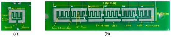 The single sensor is a simple on/off touch button. The X and Y electrodes for each channel are interdigitated comb electrodes, which are a very common type in sensing applications. Typically the X electrode surrounds the Y electrode, as it helps to contain the field between the two electrodes. The other advantages of interdigitated design are to optimize the SNR value by maximizing the coupling length between the X and Y electrodes, to increase the sensing area and so on [18] (see Figure 5a). The slider on the card having six channels is 6 cm long, in which the channels are laid together side by side. There are no borders between the channels while borders exist on the edges of the slider. Figure 5b illustrates the structure of a slider.