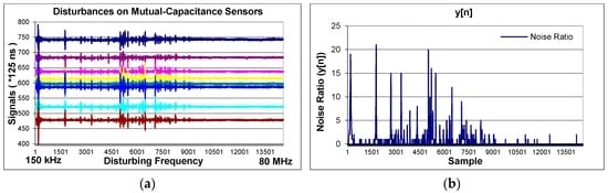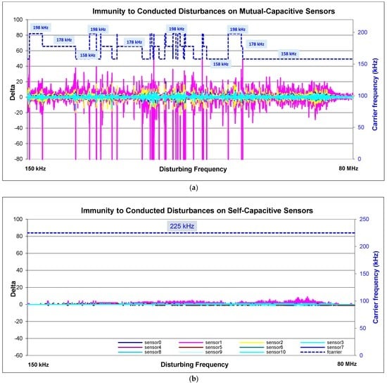 Conducted immunity test (a) frequency hopping is used and the carrier frequency varied between 158 kHz and 198 kHz when noise ratio reaches 3 and over; (b) on self-capacitance sensors.