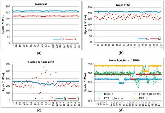 A sensor is driven at two frequencies f1 and f2 in turn such as f1-f2-f1-f2-f1-f2 (Figure 8a). Then signals are saved by injecting noise at f2. Although the sensor is driven at f1 and f2 simultaneously, signals at f2 are disrupted; by contrast, signals at f1 are not (Figure 8b). Normally, the noise varies between 150 kHz to 80 MHz. We injected noise at a constant frequency (f2) to show its effect on the sensor when driven at f2.