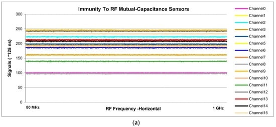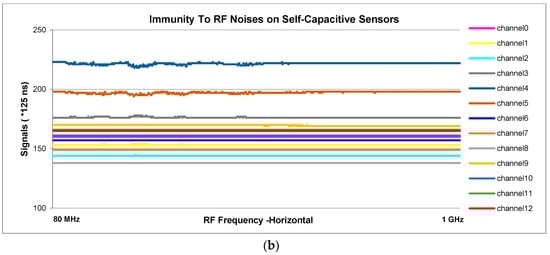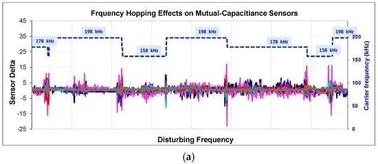 The effect is shown in Figure 14a (also Figure 7 shows the results without frequency hopping). When the carrier frequency or its harmonics overlap with the noisy frequency, the sensors are disrupted. This effect is decreasingly ongoing on high carrier harmonics. Whenever the noise ratio reaches to 3, the carrier alters and the noise decreases. Self-capacitive sensors are less affected by the conducted immunity (Figure 14b). The pink sensor is the slider which consist of six sensing channels.