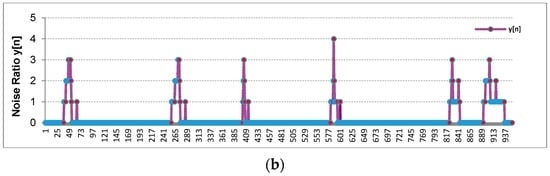 The channel noise strength, evaluated for all channels is an input argument of the infinite impulse response (IIR) filter along with the previous noise ratio— (Equation (9)). The result obtained from the IIR filter is called the noise ratio, y[n], and is defined as: