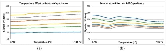 Mutual sensors use a dual-slope conversion method that means charging and discharging a sampling capacitor Cs (Figure 3) in the opposite directions respectively since the voltage across Cs mainly depends on the driven voltage (VDD) of the pin when untouched. Thus, it is more stable to the changes in temperature. Also this change is less since the measurement of mutual coupling is realized in a small local area and both electrodes are affected at the same rate. The tests are done from −5 °C to +105 °C. Figure 10 shows test results for the both cards. The maximum signal change rate is 13.75% for mutual sensors whereas it is 21.46% for self-sensors. It can be concluded that mutual sensors are more stable to temperature than self-sensors. Ambient temperature does not lead to false detection, because drift and filter algorithms can track signals easily and update the current reference values.