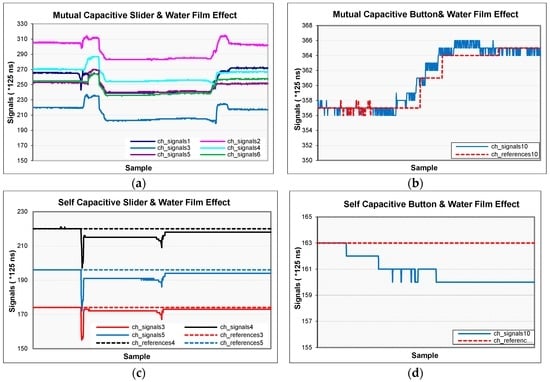 In Figure 11, water film test results are shown for the sliders and single buttons of both cards. All signals decrease at every slider channel for both types of sensors (Figure 11a,c). Because slider channels are side by side and when a pulse is sent to a channel, other channels are grounded. The electric field that propagates from one channel goes through the other channels grounded over water. So less charge reaches the receiving electrode (see Appendix A).