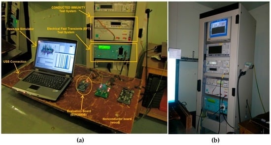 Some EMC tests are related to power supply cards. They test the immunity of cards to voltage fluctuation in power grids. Instead of designing a new power supply, an EMC approved CE mark carrying 9 V adapter was used during the tests. Therefore, only some of the EMC tests were applied. The test laboratory used is accredited by international test organizations. Taking the certificated laboratory regulations into account, related tests; in information technology equipment IEC 61000-4-6, IEC 61000-4-4, IEC 61000-4-3 [26,27,28] were applied. Figure 12a shows the measurement set-up including EMC instrumentations. The EVK2080B gathers sensor data and sends it to the Hawkeye simulator via a USB cable in the proper order. It also acts as an optocoupler to protect USB inputs against high voltage.