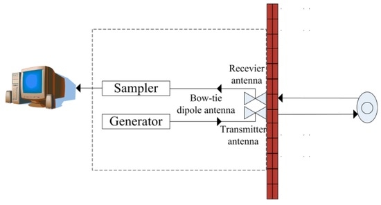 The bio-radar setup is shown in Figure 1. Bow-tie dipole antennas, commonly referred to as the transmitter antenna and the receiver antenna, stuck on the wall using Velcro are employed for the transmission and reception of the electromagnetic waves. Pulses generated by a pulse generator with a pulse-repetition frequency (PRF) of 128 kHz are sent to the transmitter antenna for exciting the bow-tie dipole antenna. The echo pulses are received by the receiver antenna with a center frequency and bandwidth of 500 MHz each. Further, the echo pulses are input to a sampler and sampled at selective ranges according to range gate generated by a delay circuit and a range gate generator. Note that the transmitted pulses and the delay are produced by the same oscillator.