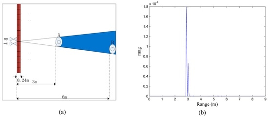 As shown in Figure 2a, the farther target, B, is located in the shadowing area caused by the closer target, A. In Figure 2b, as the energy of the reflected signal from B is considerably weaker than the energy of the reflected signal from A, target B cannot be detected based on the energy detection of the respiratory response. To solve this problem, a new target identification method is proposed in this paper that does not rely on the energy of the reflected signal.