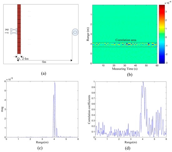 In the first scenario, although there is no target in the detection area, as shown in Figure 5a, Figure 5b shows that the energy at the location situated 5 m from the radar is obviously greater than the other locations. The previous method of target identification based on the energy detection of the respiratory response is likely to result in a wrong judgment, i.e., the noise or clutter may be mistakenly considered a target. In Figure 5c that displays the correlation coefficients between the waveform at the 5 m location and the waveforms at other locations, we can find that the correlations are low, despite the fact that the strongest energy is present at the 5 m location. It appears to be random and independent as a correlation area does not exist at the 5 m location. Therefore, it is noise rather than breathing. Figure 5d shows the final result of our processing based on the cross-correlation, indicating that there is no target in the detection area because no red squares appear along the diagonal line of the correlation coefficient matrix; hence, false positives do not occur in our end result.