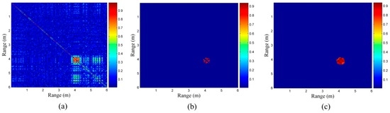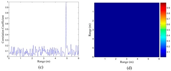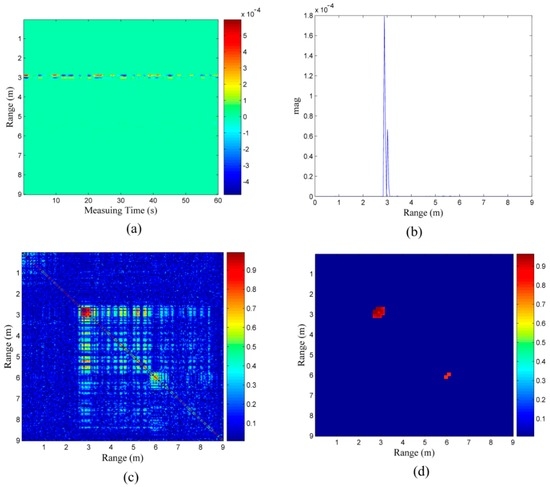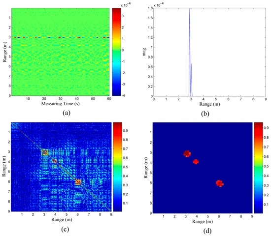 As mentioned previously in Figure 2b, as the energy of target B is considerably subtle compared to target A, target B cannot be detected. This mainly because target B is located in the shadowing area caused by target A. In Figure 6a,b, we can find only one target, situated 3 m away from the radar, and the farther target at 6 m cannot be detected. The previous method based on the energy detection of the respiratory response produces an incorrect result with a false negative. In Figure 6c, the correlation coefficient matrix, we can find that the correlation coefficients of the region at 6 m are also large, although their correlation is smaller than those at the 3 m location. In the final result is shown in Figure 6d, there is an another obvious target at the 6 m location, besides the one at the 3 m location; therefore, the problem of the false negative is resolved.