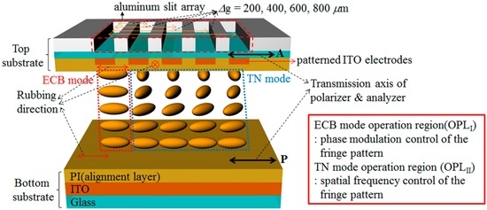 The operation principles of our DFPG and field-dependent LC orientations on each patterned slit are shown in Figure 2, where the projected fringe patterns, which were measured under the far-field interference conditions using a CCD camera, are co-plotted according to the applied voltage conditions. As shown in Figure 2, the common slit is aligned with the ECB LC mode that can modulate the phase shifting and the four switching slits are aligned with the TN LC mode that can modulate the spatial frequencies of the fringe pattern. Under the parallel polarizer condition, the LC alignment direction of the bottom substrate is parallel with the transmission axes of the top and bottom polarizers. Therefore, the incident polarization state after the bottom polarizer does not change irrespective of the applied voltage within the ECB LC mode. The incident beam passing through the ECB LC layer always transmits the top polarizer after passing though the common slit without intensity loss irrespective of the applied voltage.