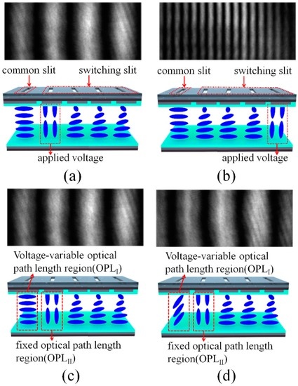 Under the fixed spatial frequency attained by selecting the switching slit of one TN LC layer, the four-step phase-shifting schemes can be achieved by applying voltages to the ECB LC layer of the common slit for an appropriate phase difference with the phase of the selected switching slit. The phase shift is decided by the optical path length difference between the ECB LC layer and the field-applied TN LC layer under two slits of one common slit and the selected switching slit, respectively. Figure 2c,d show the initial and the relatively moved fringe patterns according to the applied voltages in the ECB LC layer for the same selected switching slit condition, where the spatial frequencies of two fringe patterns maintain each other. The effective refractive index of the ECB LC layer can be varied by applying voltages because the incident polarization is parallel to the rubbing direction of the LC alignment layer, and the LC layer operated with the ECB LC mode, which has a field-dependent tilting redistribution of the LC layer, does not exhibit any LC twisting distortion irrespective of the applied voltages. Thus, the optical path length passing though the common slit can be modulated according to the voltage applied to the ECB LC layer. For 3D depth extraction from the projected fringe patterns, which are distorted by an object, four-step phase shifting, especially over 3π/2 phase shifting, is needed, and the thickness of the DFPG LC cell is designed considering the birefringence of the LC used in our experiment.