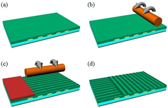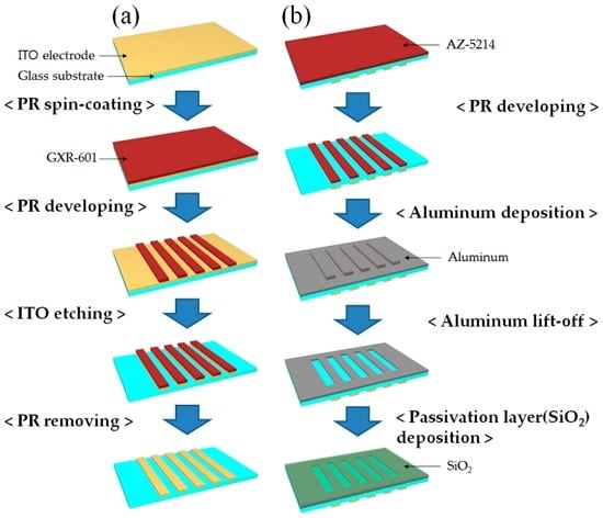 To electrically control the spatial-frequencies and phase modulation of the fringe patterns, the ITO electrodes were patterned by a photolithography and chemical etching process, as shown in Figure 3a. The first step for developing the patterned ITO electrodes was the spin-coating of a positive photoresistor (GXR-601, AZ Electronic Materials Co., Wiesbaden, Germany) on the ITO glass substrate. The GXR-601 photoresistor was coated under the conditions of 2500 rpm for 5 s, 3500 rpm for 30 s, and 2500 rpm for 5 s. After the spin-coating process, the coated ITO glass was heated to 90 °C on a hotplate for 90 s. Then, the coated photoresistor was projected through the photo-mask pattern by ultraviolet light and was etched with the photoresistor developer (AZ300, AZ Electronic Materials Co.) for 18 s.