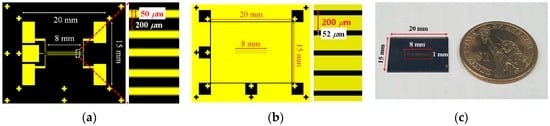 Figure 5a,b show the photo-mask used for the ITO etching and the Al slit patterning process, respectively. In Figure 5a, five wide ITO patterns, directly connected to each ITO line pattern, can be seen, which were prepared for the wire-bonding process to control the electro-optic properties of the common slit and five switching slits individually with the driving signals. Figure 5c shows the finally implemented top substrate of the DFPG with the patterned ITO electrodes and the Al slit arrays. The substrate size was 15 × 20 mm2 in our sample implementation. The size of the actual area, which optically acts as the DFPG, was almost 8 × 1 mm2.