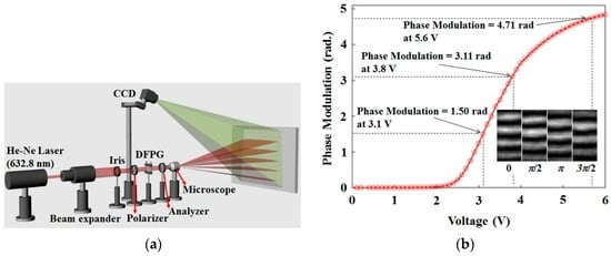 (a) Optical system for measuring phase modulation values of the common slit according to an applied voltage and their moving fringe patterns; (b) Measured phase modulation curve according to an applied voltage and the fringe patterns captured under Δφ = 0, π/2, π, and 3π/2 conditions.