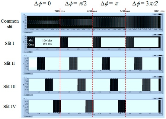 Figure 7 shows the time sequence of the driving waveforms applied to the common slit part and four switching slit parts used for our DFPG. The driving waveforms for the common slit were changed every 200 ms and the amount of the applied voltage was increased to 2.1 V, 3.1 V, 3.8 V, and 5.6 V at 1 kHz to achieve phase shifting of Δφ = 0, π/2, π, and 3π/2, respectively, as shown in Figure 6. At a given phase-shifting amount condition, four-step spatial-frequency-varying fringe patterns were projected by applying dual-frequency-driving waveforms to the TN LC parts individually operated by the four patterned ITO electrodes. The turn-on waveform for each TN LC part of the switching slits was applied with 5 V of the applied voltage at 1 kHz for 50 ms, and then the turn-off waveform was applied with 5 V of the applied voltage at 100 kHz for 150 ms. These frequency-modulating AC waveforms were applied in sequence to the ITO electrode pattern of each switching slit every 50 ms to obtain four sets of fringe patterns with four different spatial frequencies. When applying the turn-off waveform with high frequency AC driving to the switching slit IV, the voltage required for the next step of the phase-shifting was applied to the ECB LC layer of the common slit and then, frequency-modulating waveforms were sequentially applied to the four TN LC layers to select four different spatial frequencies of the projected fringe patterns. In this manner, the whole scanning time required for the four-step multi-spatial frequencies and four-step phase shifting schemes could be completed in less than 800 ms. This means that the optical surface profilometry can capture 16 sets of fringe patterns distorted by an object in less than 800 ms. Our profilometry using the DFPG can exhibit quite fast scanning and capturing speeds suitable for hand-held dental applications, compared with our previous study of a 3D optical surface profilometry system constructed with a mechanically moving optical element [21].