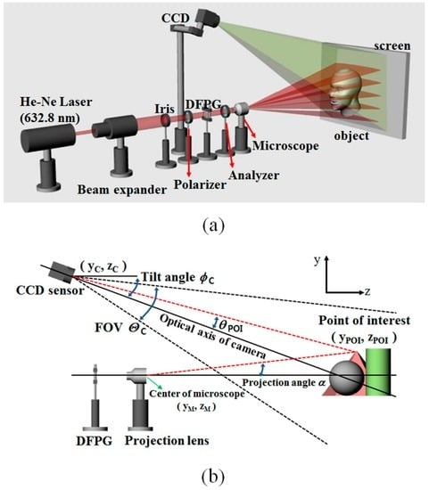 (a) Optical set-up to reconstruct the depth profile of a 3D object with the DFPG device; (b) Geometrical parameters of the 3D vision system used for 3D depth extraction.