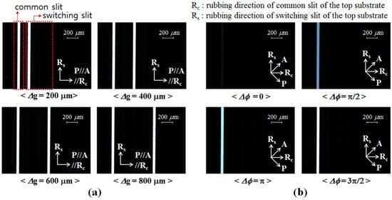 To observe the field-dependent birefringence change in the ECB LC layer under the common slit, POM images of the DFPG cell were obtained between the crossed polarizers after detaching the parallel polarizers from the DFPG cell, as shown in Figure 9b. In this measurement, the POM images were captured by rotating the rubbing direction of the bottom substrate of the DFPG cell by 45° with respect to the crossed polarizers. On the common slit area, light transmittance or a color change could be observed owing to a variation of the phase modulation with increasing applied voltage to the ECB LC layer.