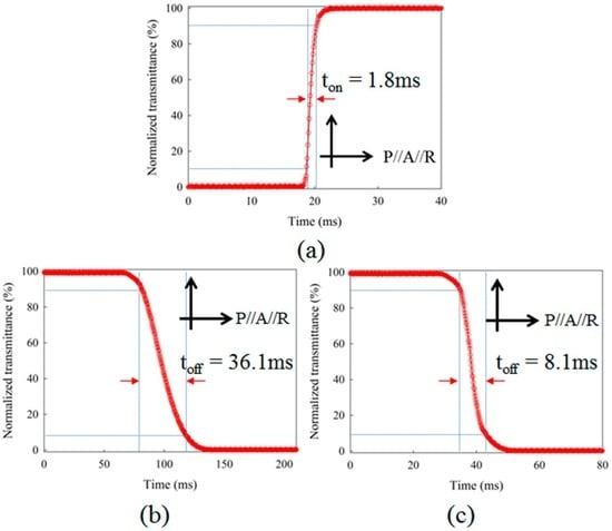On/Off response times of the LC layer of the DFPG. (a) Field-on response time; (b) Field-off response time obtained by the natural relaxation of the LC layer due to the surface alignment effect without applying any electric field; (c) Off response time obtained by applying a high frequency field to the LC layer utilizing the frequency inversion effect of the LC dielectric anisotropy.