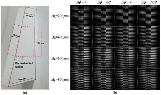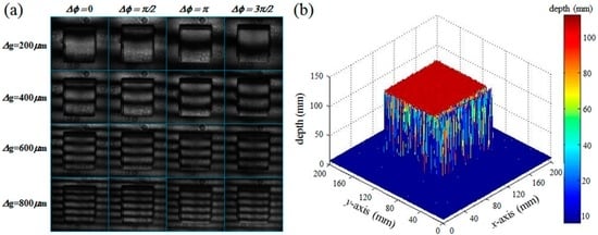 Figure 11a shows a the photographic image of the object used for the 3D depth extraction with the presented 3D optical surface profilometry system, which was deliberately chosen to have a continuously slanted surface together with an abrupt depth change discontinuity from the background reference surface. The smallest height at the abrupt side edges of the slanted object was over 40 mm, which was much higher than the optical wavelength used in our experiment. The regions marked with the dotted red box were reconstructed after projecting multiple sets of fringe patterns with our DFPG. Figure 11b shows the 16 sets of fringe patterns distorted on the slanted object. Four sets of laterally moved fringe patterns were obtained by changing Δφ via the common slit control. At a given Δφ condition, multiple fringe patterns having four different spatial frequencies were sequentially projected by selecting the Δg condition of the switching slits. Because there was a high depth discontinuity between the slanted surface and the background surface, some bright (or dark) fringe lines on the slanted surface were continuous with those on the background surface. This optical phase ambiguity could be solved using the four-step phase shifting scheme during the depth reconstruction [21,27].
